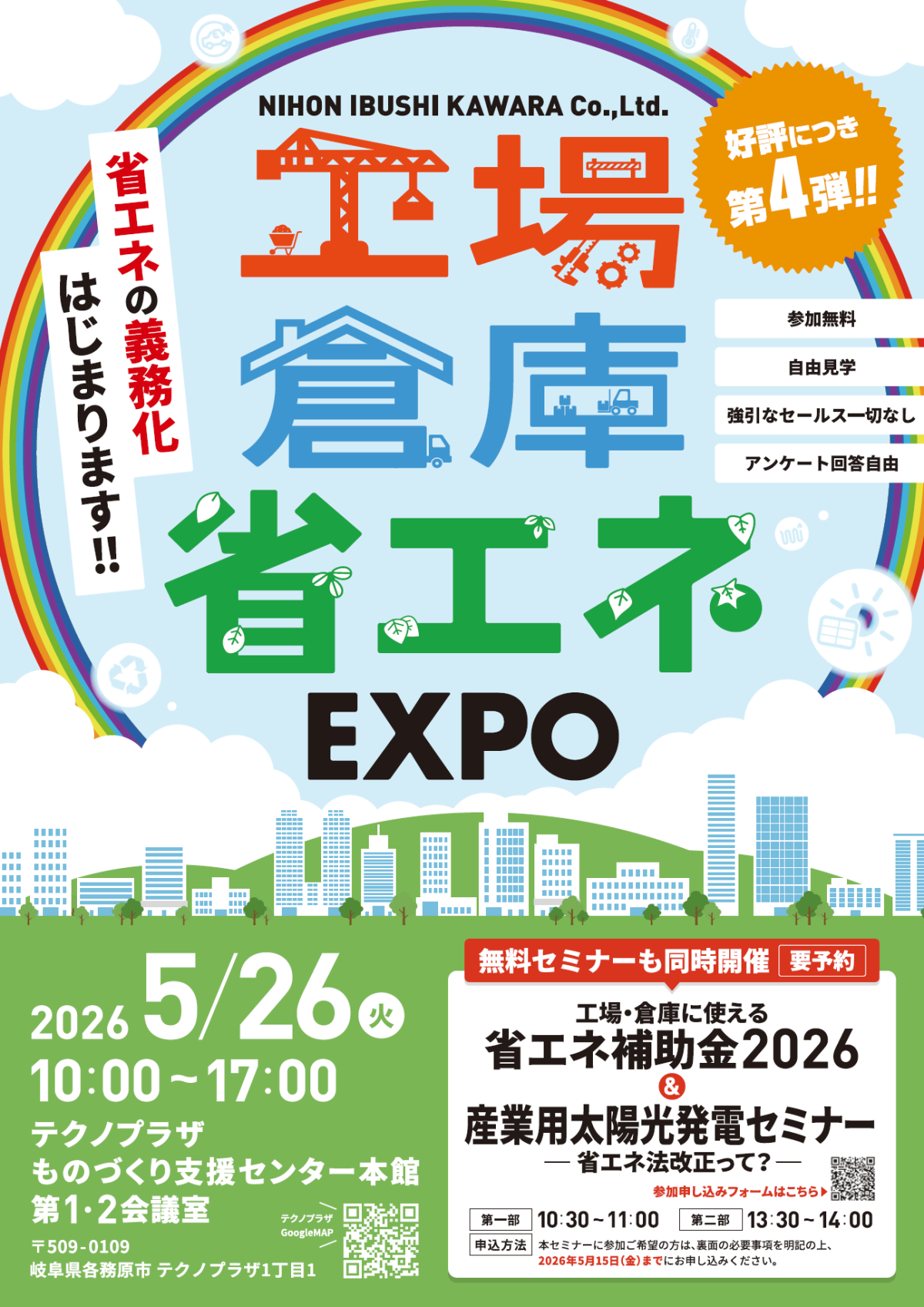 日本いぶし瓦株式会社は、2026年5月26日(火)に、好評につき第4弾となる「工場・倉庫省エネEXPO」を開催いたします。
